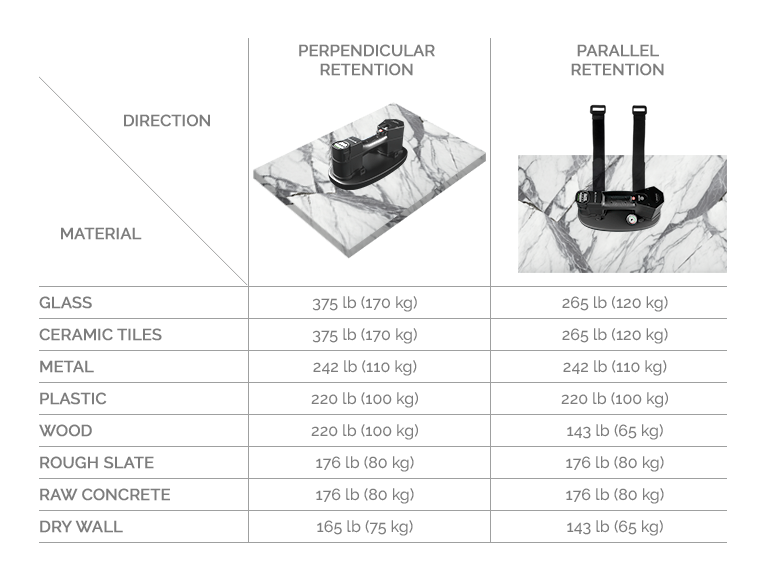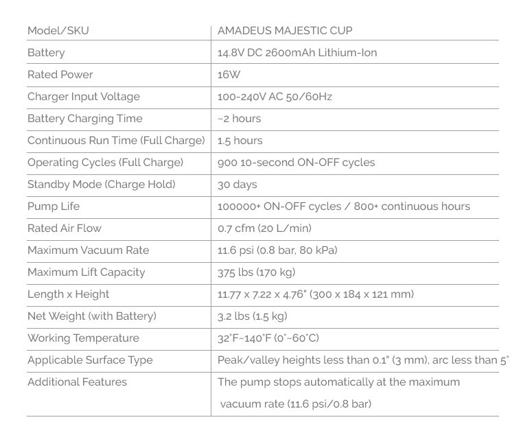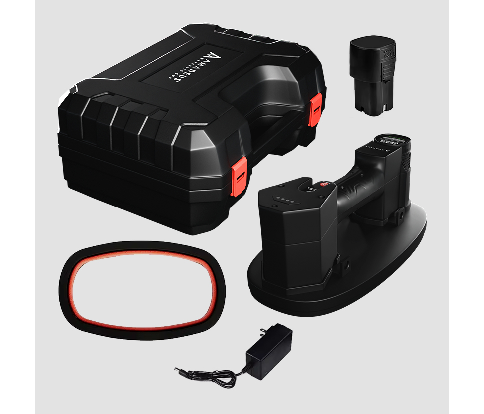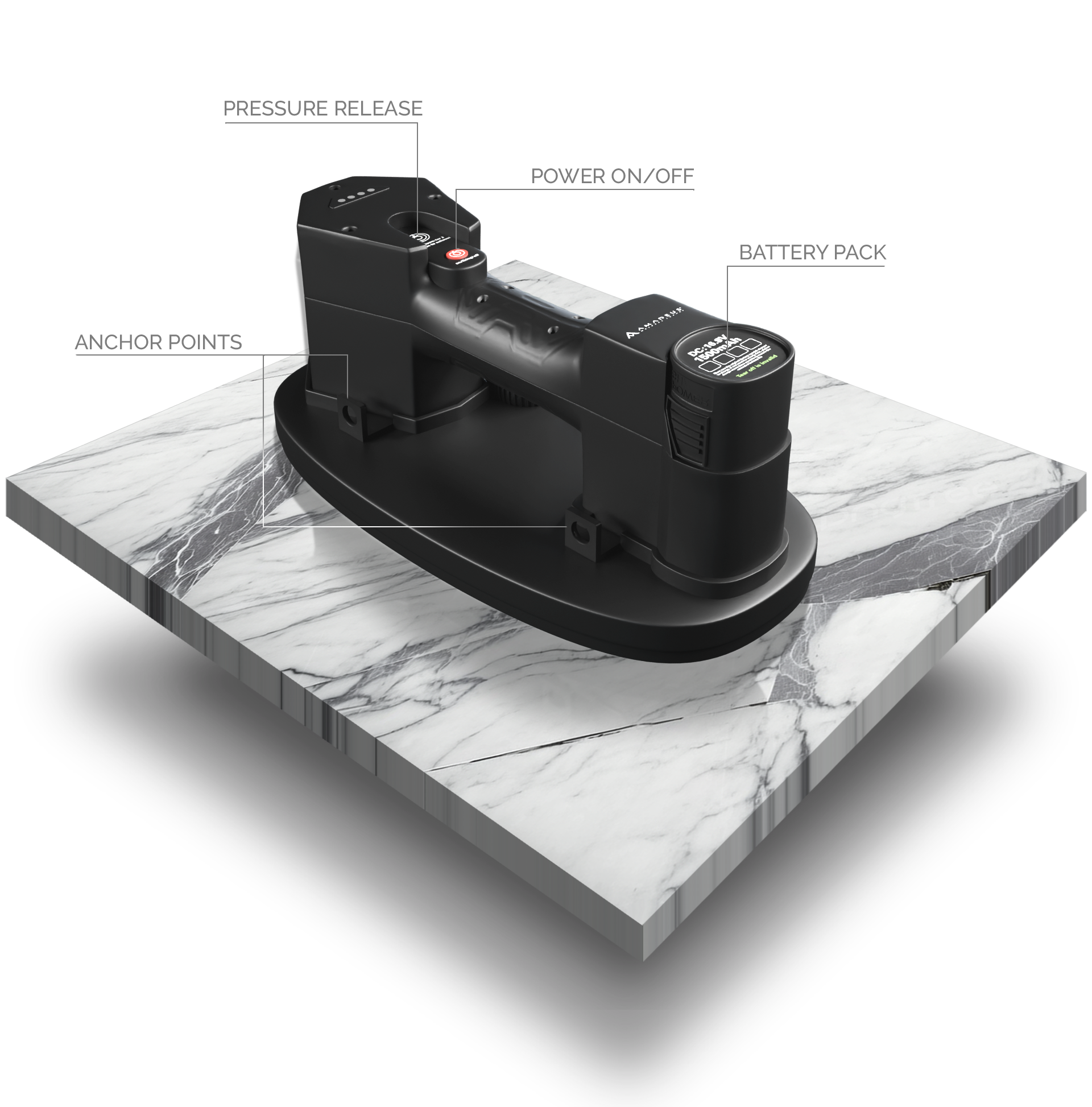 The Amadeus Majestic Cup is equipped with a robust vacuum pump. The tool’s foam rubber vacuum seal is strong and resistant to loss of vacuum pressure. Once the pressure pump is activated, it creates a strong suction and sticks firmly to any flat non-porous surface. The suction is strong enough to hold firm loads even up to 375 lbs. To lift any slab of flat solid material, simply turn on the unit and place it directly on the surface. The Amadeus Majestic Cup automatically monitors the vacuum and if vacuum pressure is lost, the pump automatically turns on until vacuum pressure is restored.